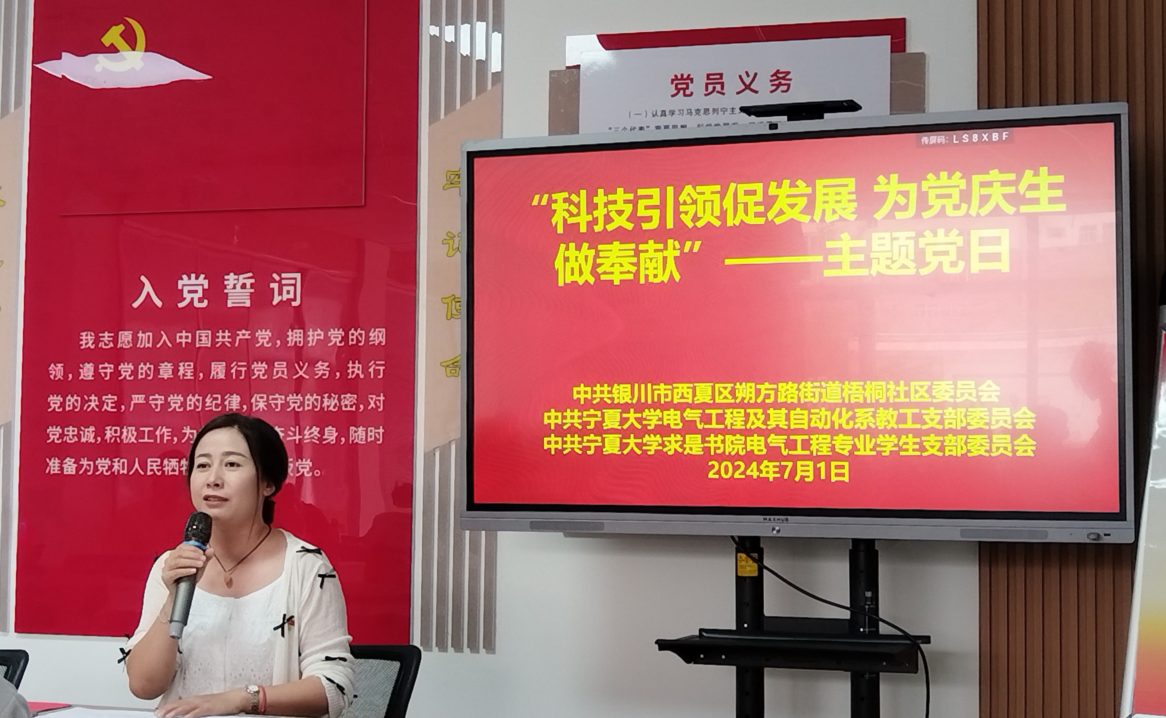 【必威体育 讯 宋娟/文、图】为进一步强化党建引领,深化“高校+社区”合作共建模式,加强校社资源融合共享,推进校社党建工作创新提升,7月1日,必威体育 电气工程及其自动化系党支部联合求是书院电气工程专业学生党支部赴西夏区朔方路街道梧桐社区开展共驻共建活动。社区党委书记于婷、西夏区科协科普辅导员马晓云、电气工程及其自动化系党支部书记宋娟、求是书院电气工程专业学生党支部书记高文静及学生党员参加活动。