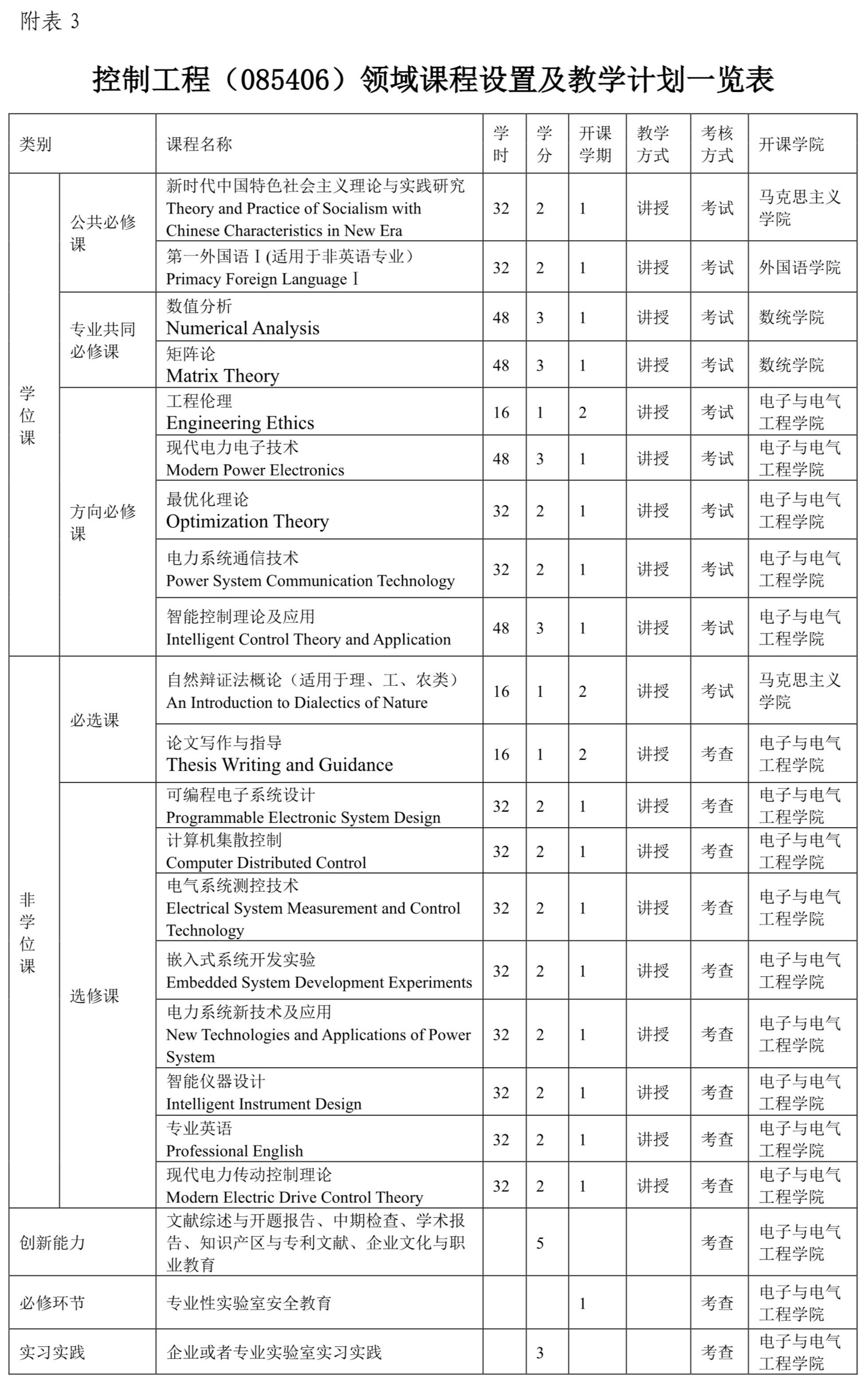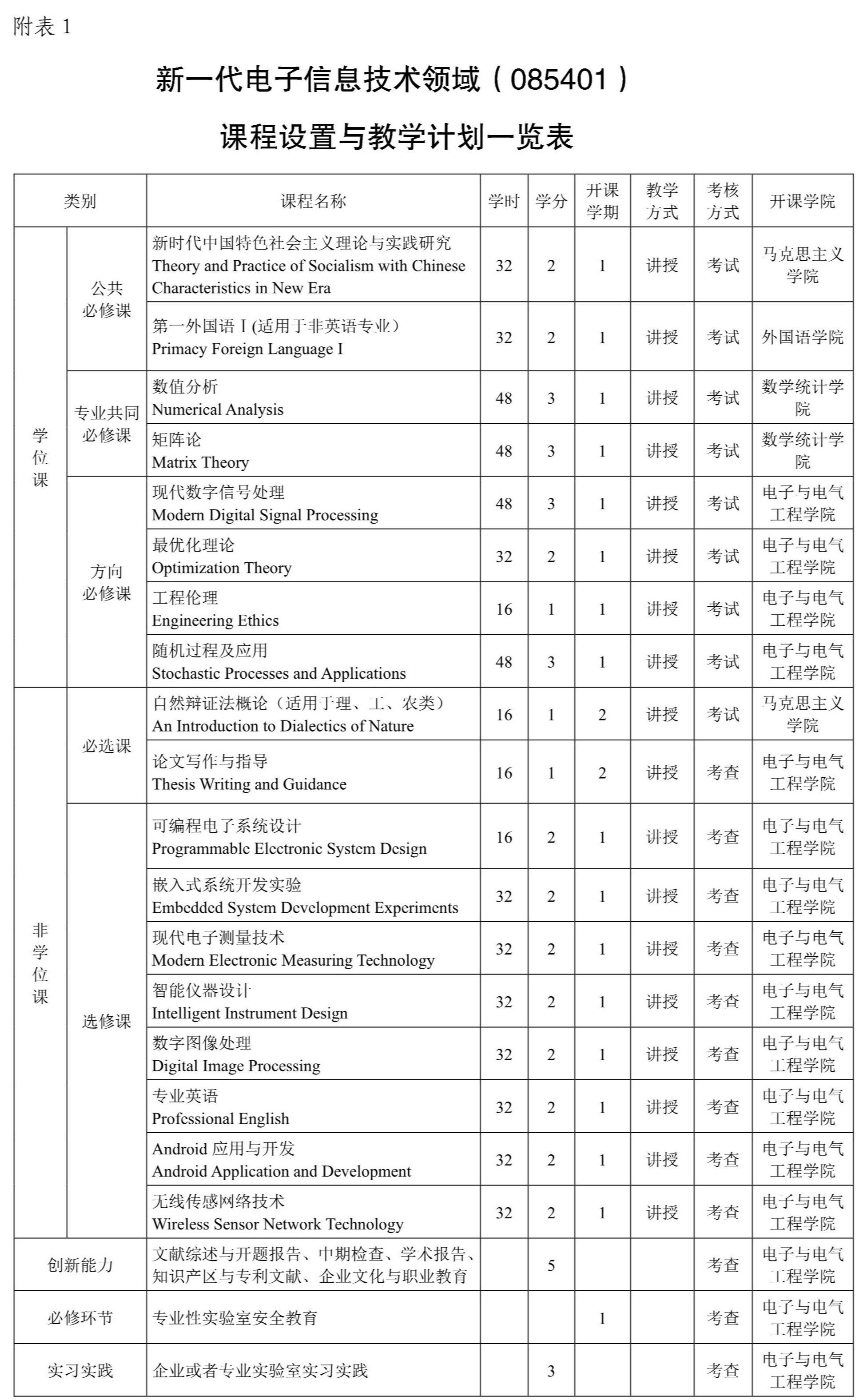 课程设置要以电子信息、能源电力等行业实际应用为导向,以职业需求为目标,以综合素养和创新能力的培养为核心。教学内容和课程设置要强调理论性与实践应用性课程的有机结合,突出案例分析和实践研究,教学过程要重视运用团队学习、混合式教学、模拟训练等方法;课程设置分为学位课、非学位课和实践创新三个模块,学位课分为公共学位课和专业学位课两部分,16学时计1学分。学分要求:最低32学分,最高38学分。其中公共学位课5学分(含外语2学分、政治理论2学分、工程伦理1学分),专业学位最低13学分(含数值分析3学分、矩阵论3学分,其他专业学位课7学分),专业非学位课最低6学分,实践创新环节8学分(含文献综述与开题报告1学分,必威体育与职业教育1学分,中期检查报告1学分,知识产权与专利文献撰写1学分,企业实践基地或者校内外专业实验室实习实践3学分、学术报告1学分。必修环节的专业性实验室安全教育是研究生进入实验室进行科学研究的必修教学环节,要求在研究生入学第一学期完成由学校实验室与资产管理处开设的实验室安全网络培训课程学习,并参加网络在线考试取得合格证。