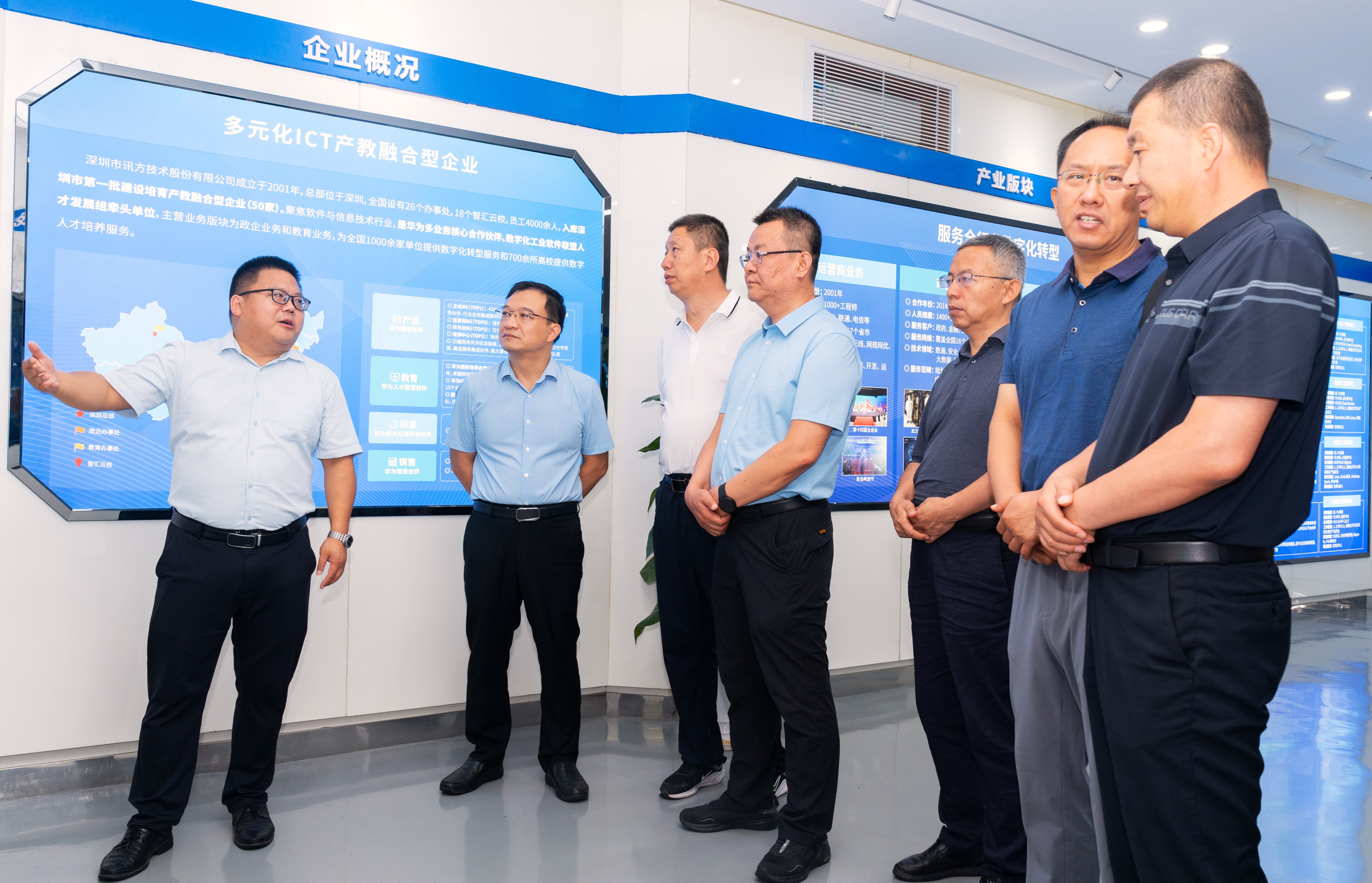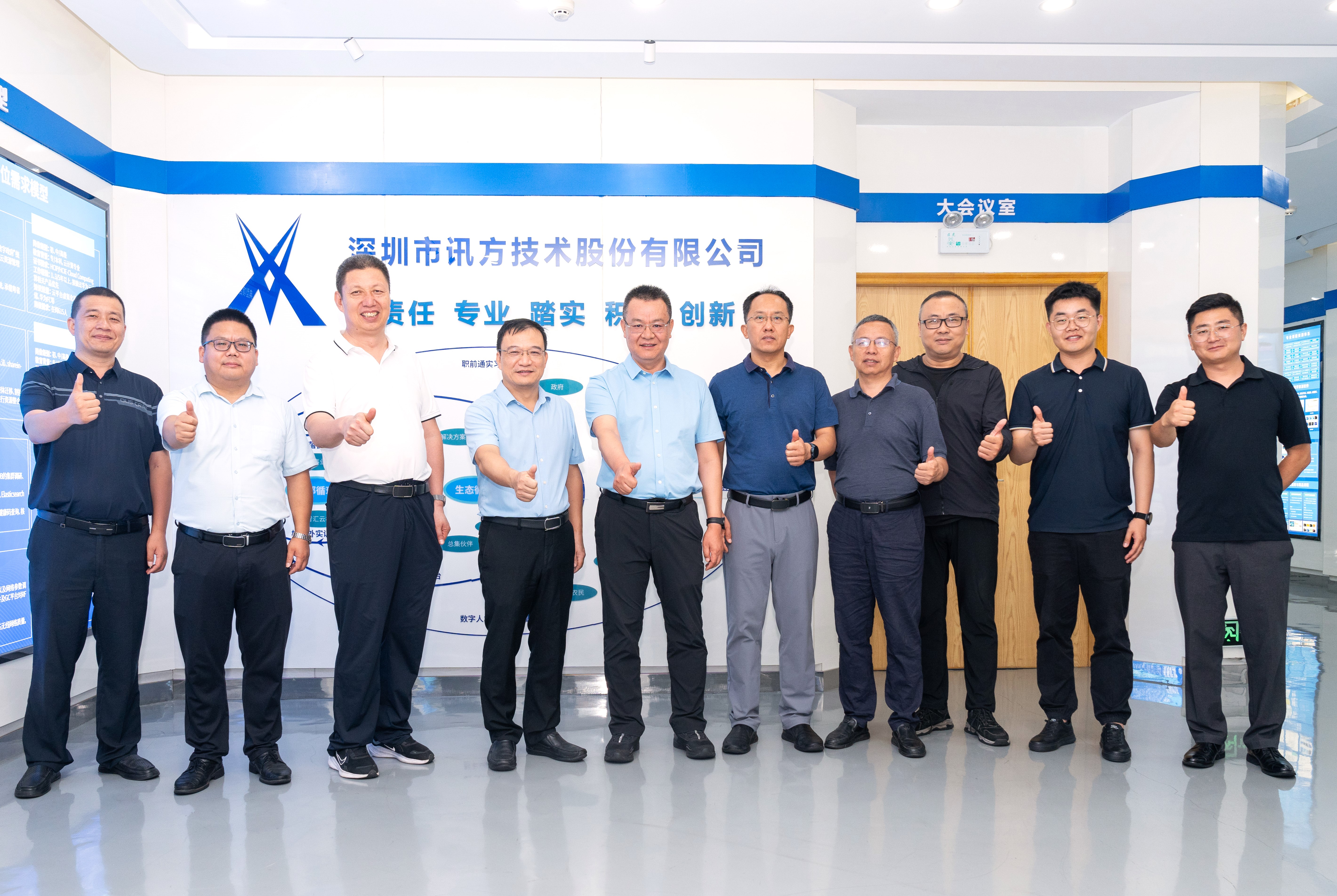 一行来到深圳讯方技术股份有限公司,在讯方技术股份有限公司董事长戴毅的陪同下,就产教融合、校企合作、实验室建设、ICT人才培养与实习实践方面进行考察调研。