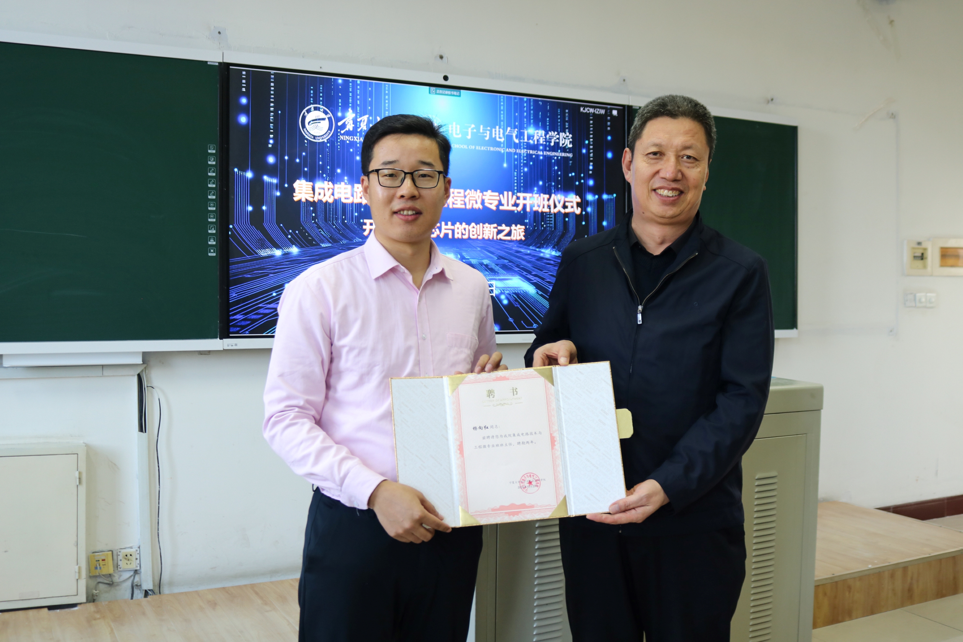 开班仪式上,学院党总支书记何彦平向首届集成电路技术与工程微专业班主任杨向红颁发班主任聘书。