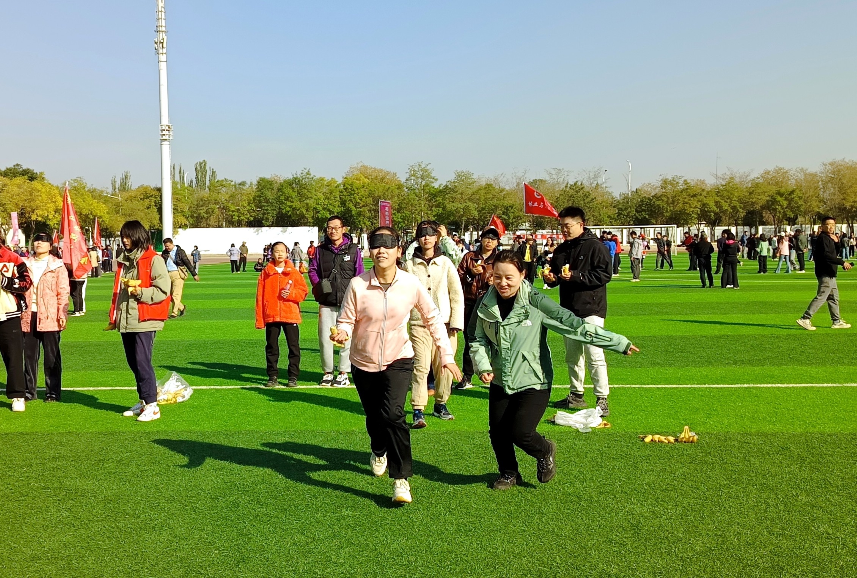 教师通力合作,在歌声与步伐中传递欢乐;“协作传球”环节,大家步调协调,灵活控球,展现出沉着与技巧;而在轻松有趣的“蒙眼吃香蕉”项目中,参赛老师相互配合、趣味互动,将现场气氛推向高潮。