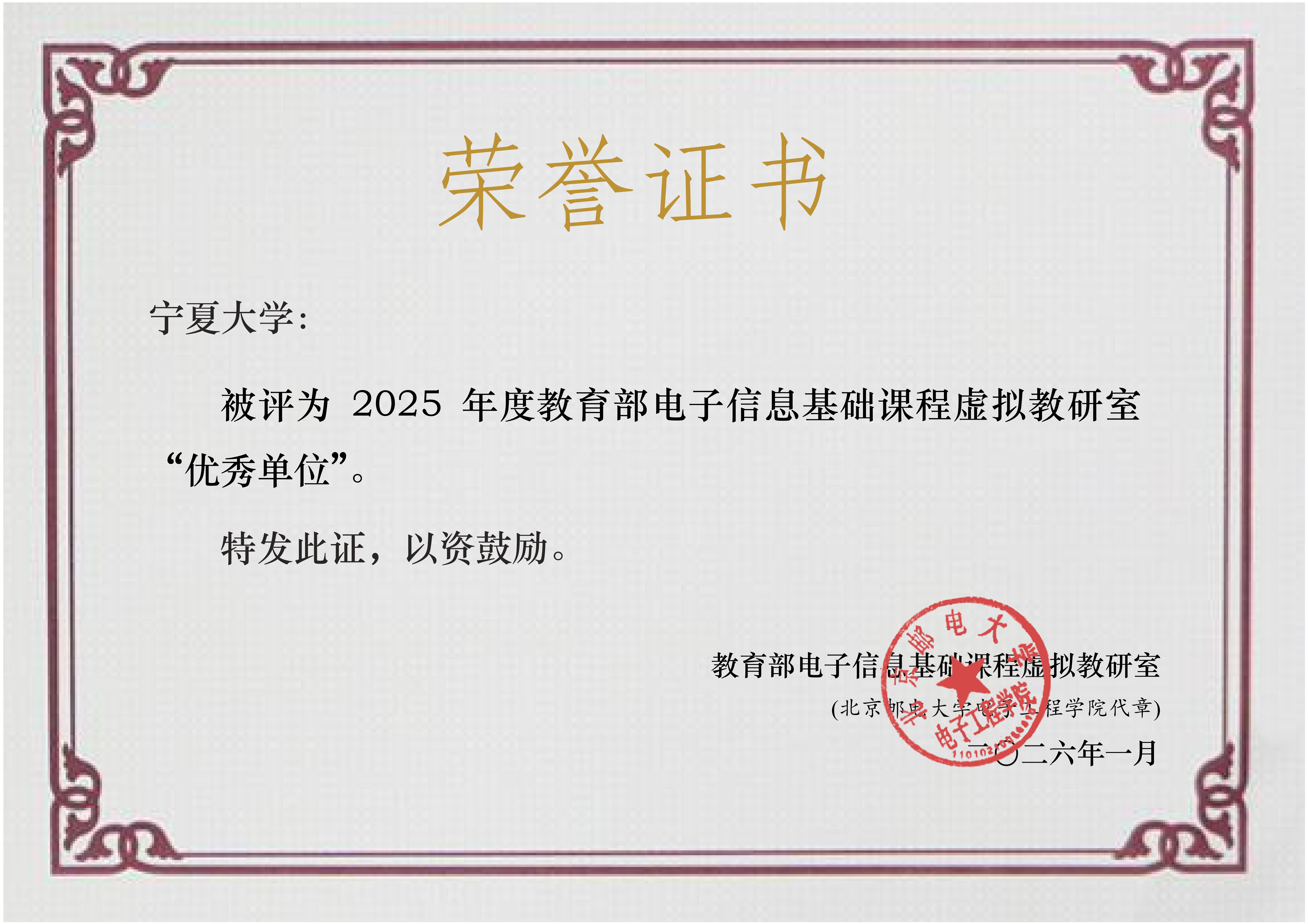 长期积极参与国家级教学平台建设、持续推进电子信息类专业教学改革成效的充分肯定。学院将以此次荣誉为契机,继续支持教师开展跨校、跨区域教研协作,进一步深化教学创新,加强资源共享与成果转化,助力教师专业成长,为学校“双一流”建设和高质量人才培养提供坚实支撑。