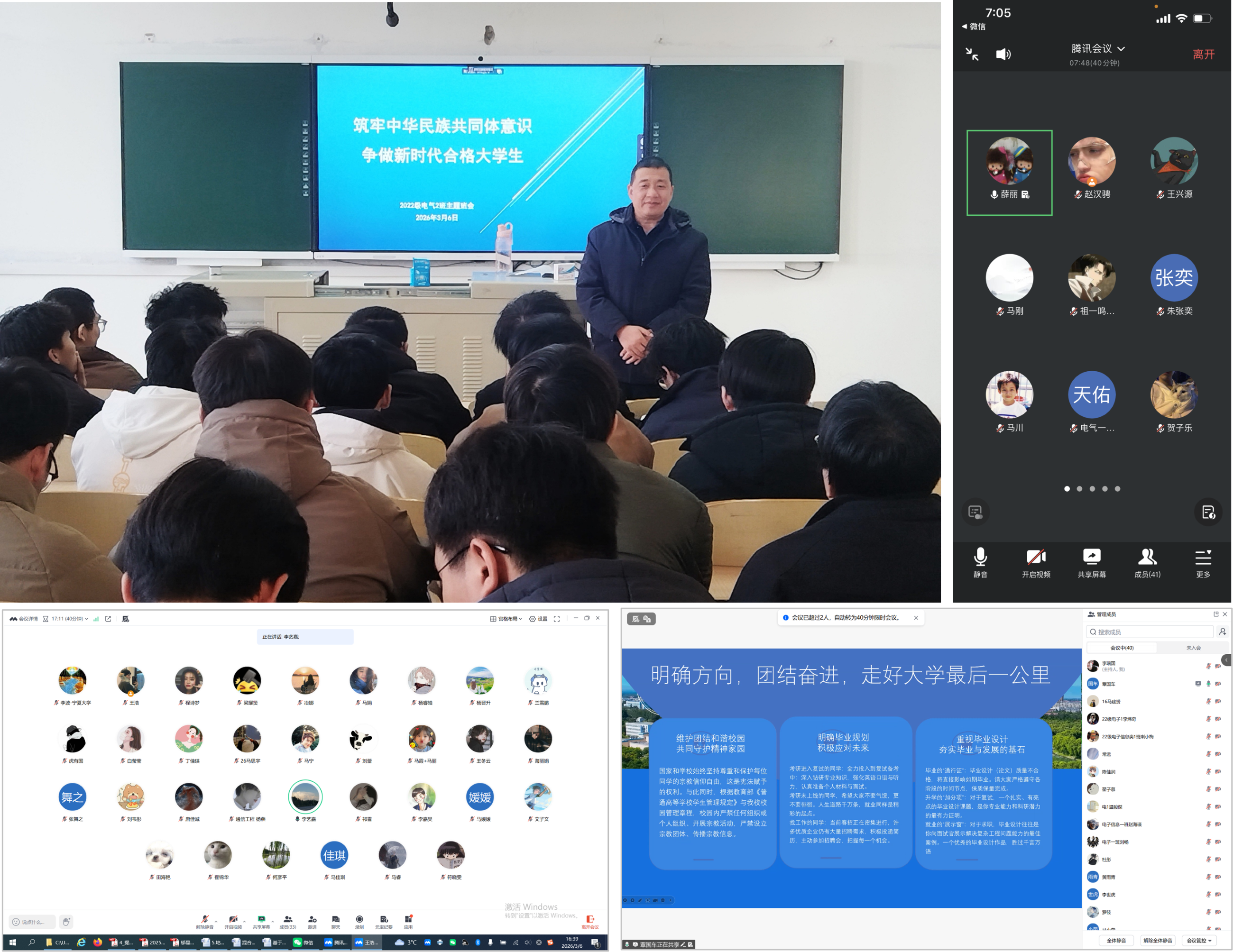 班主任号召全班同学要团结互助、凝心聚力,不断增强集体荣誉感,携手营造积极向上、和谐融洽的班级氛围。通过典型案例的讲解,引导大家进一步强化意识形态风险防范意识,深刻认识防范宗教向校园渗透的重要性,将其作为不可逾越的政治红线和安全底线,坚决筑牢思想防线。同时,要不断提升防范电信网络诈骗、实验室安全及日常交通安全的意识和能力,切实增强自我保护本领,共同为平安校园建设贡献智慧和力量。
