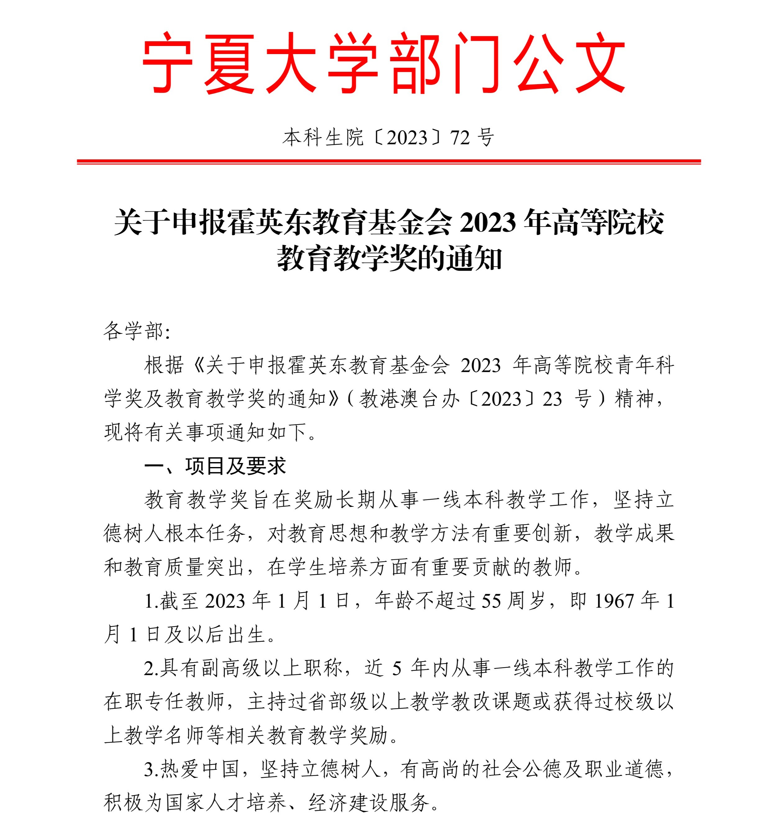 关于申报霍英东教育基金会2023年高等院校教育教学奖的通知