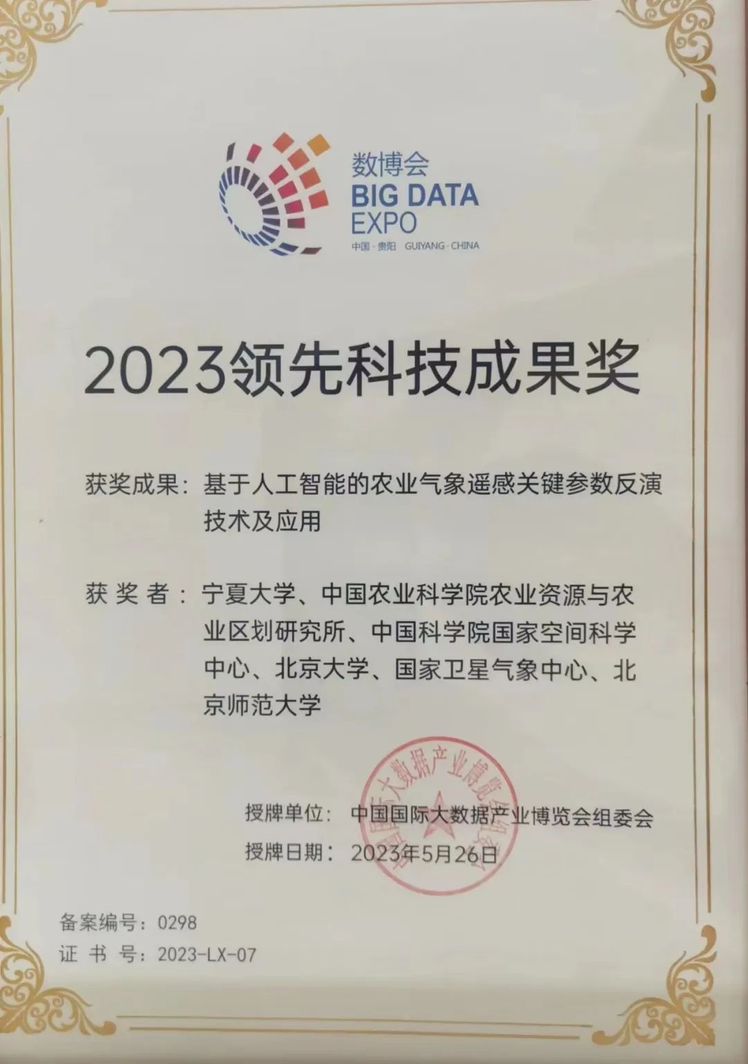联合中国农业科学院和中国科学院等3家科研单位共同研发的“基于人工智能的农业气象遥感关键参数反演技术及应用”,从357个申报项目中脱颖而出,荣获 “2023领先科技成果奖”。